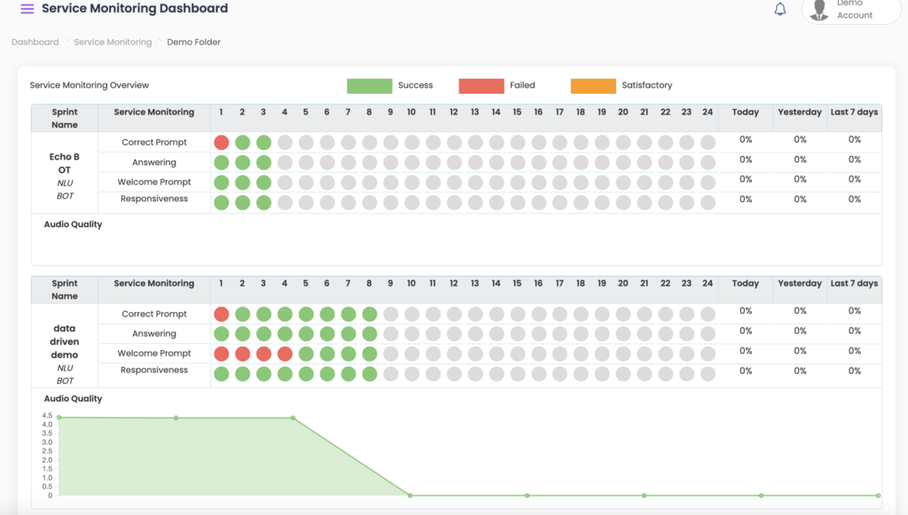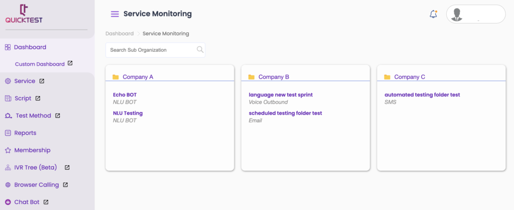 Located at the top-right corner of the dashboard, ‘Service Monitoring’ provides you with a visualization of the health of your channels by conducting tests with pre-defined parameters.