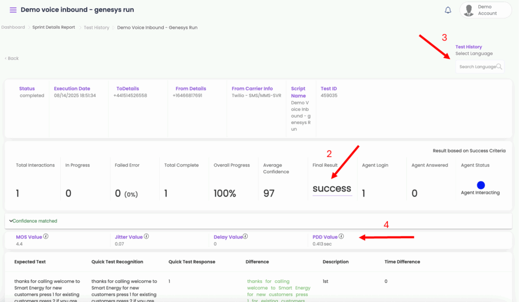 - You can convert test results from one language to another (e.g., English to Spanish) using the Select Language dropdown.