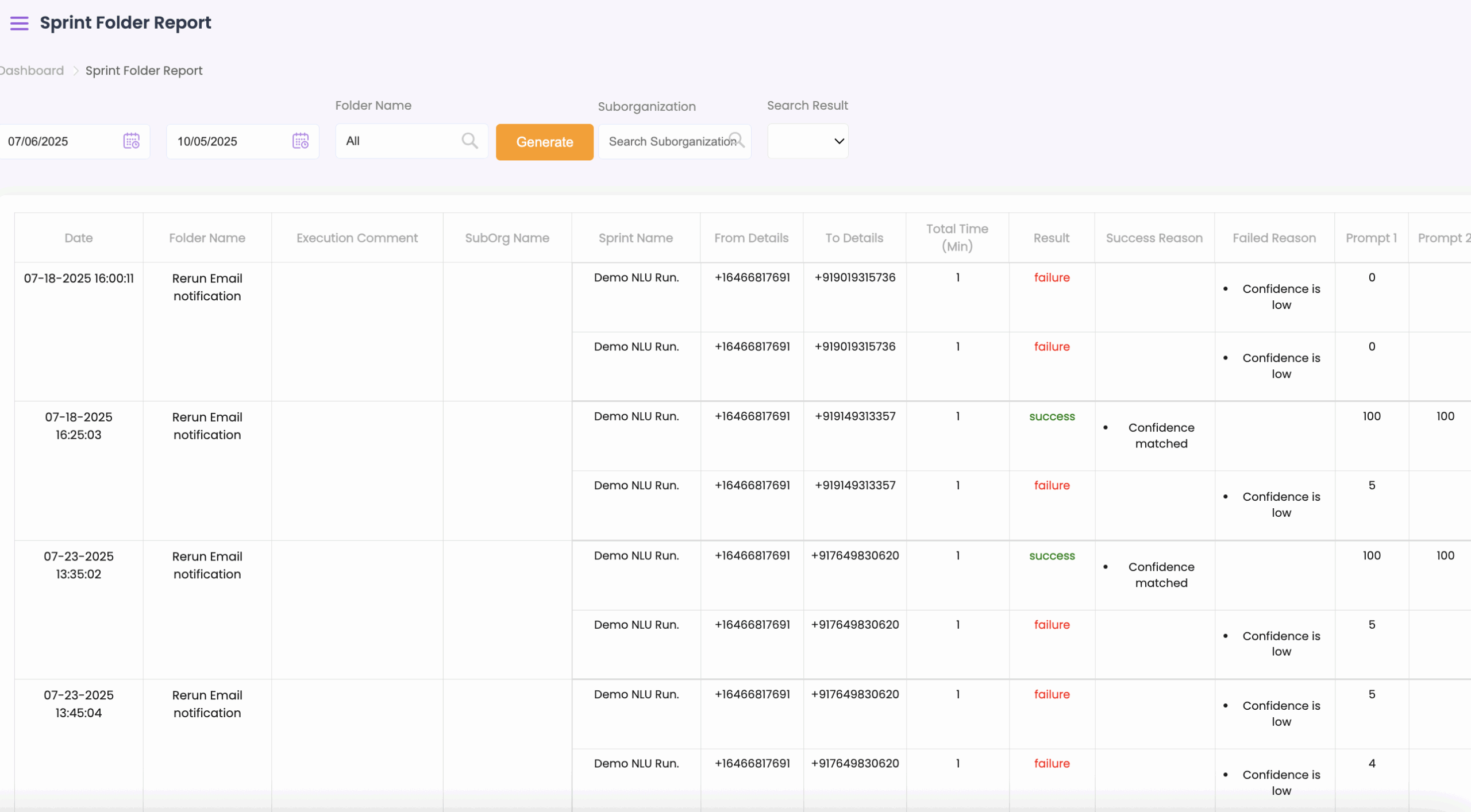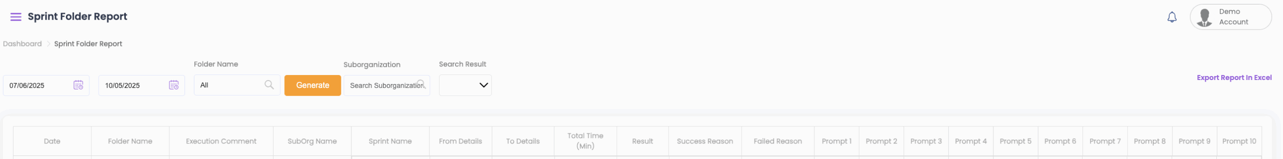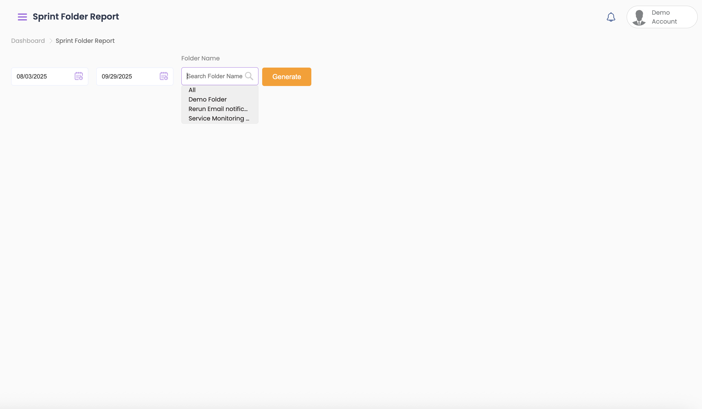 - Select the start and end dates from the top and click on Generate to view the folder test results.